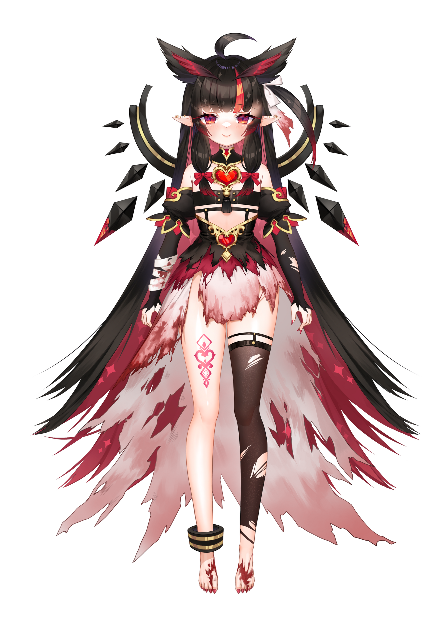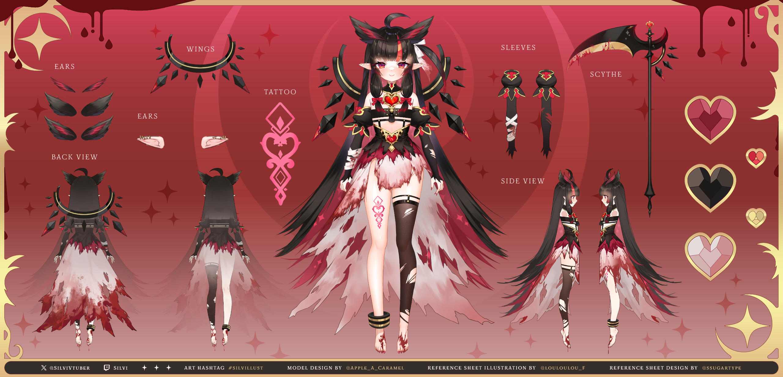 Representation of Anger, The hurt of having a bleeding heart, wearing your heart on your sleeve and getting hurt because of it, and wanting to unleash suppressed emotions.Alone in the cold solitude of her ice egg, Silvi has lots of time to think. She ruminates on her feelings and comes to various conclusions. Why must she be made to suffer? Why does her heart want to hold on to this sadness? Why couldn't the human boy simply have stayed with her, then she wouldn't be feeling all of these awful things. If only he had stayed... yes... it's his fault, she thought. The more she thought, the angrier she became. The anger built and built until it eventually overtook Silvi's mind, and turned her towards the darkness. Silvi’s frozen crystal heart, which she had so carefully encased in ice, emerged from her chest, crimson and bloody, put on display for the world to see. Her ice magic was transformed into blood magic, and the crystals on her leg and arm gathered together, forming themselves into a dark and golden scythe. Dark wings of crystal reminiscent of the dark side of the crescent moon emerged, symbolising her new powers. Her transformation had burst the ice egg in her tree open such that all that remained were smoking shards of black ice strewn around the once snowy forest floor. The tree that held the egg became dark and twisted, and her ice palace which was inside had also changed in accordance with Silvis new power. Silvi thought to herself that others should feel the pain she felt, others should pay for the suffering that she went through because of that human boy she met years ago. So she left her forest and her home in the tree and went to the human village. The village had grown large since many years had passed and the humans now thrived, smiling and happy. How could they be happy when she had been alone and suffering this whole time? Why didn't the human ever come back for her? Surely all humans were just as bad as he was. They don't deserve to be happy, so I will take things from them as penance for the human boy's selfishness, she thought. So Silvi flew down with her dark power and began to slaughter them. All of them. The humans tried to run, they screamed, but Silvi did not care. The heart on her chest pulsed and glowed bright red with each life she took, her scythe gleaming with blood, a vengeful smile on Silvi's face. Her sharp fangs were glistening, sneering at the humans as they desperately tried to escape her. She rejoiced in their fear and anguish, revelling in her new found power. Finally feeling something again after so long... it felt... good. The crescent moon in the sky grew large and began to bleed, staining the sky with red light. Silvi's eyes shone red in the darkness and she wiped blood away from her mouth.This story will be told in an upcoming song titled End of Time.